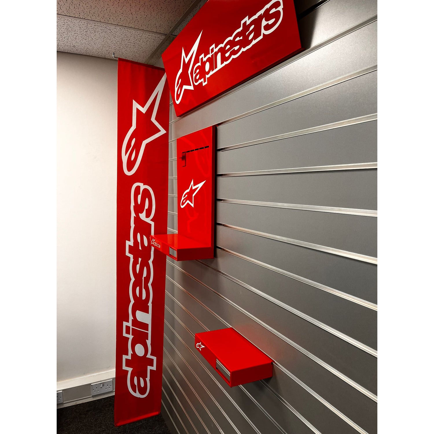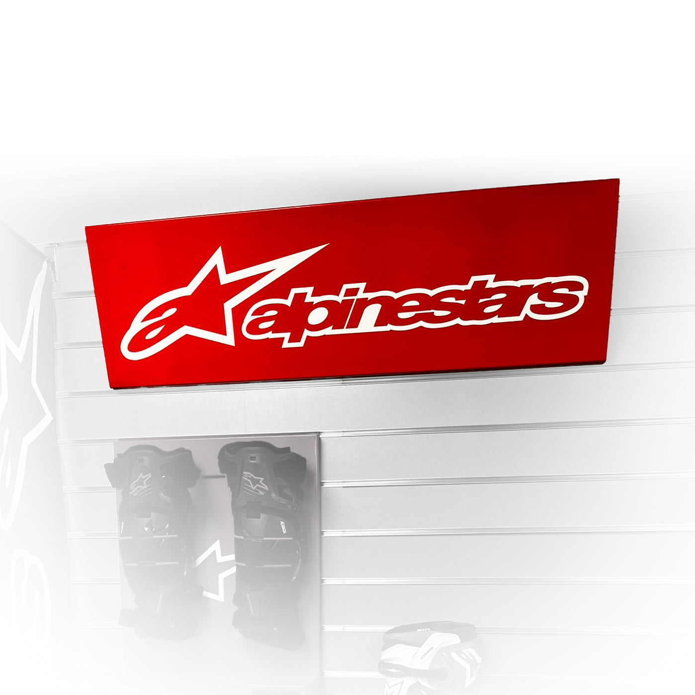Eye-catching red header sign featuring the Alpinestars logo, designed to highlight the availability of Alpinestars apparel and accessories/