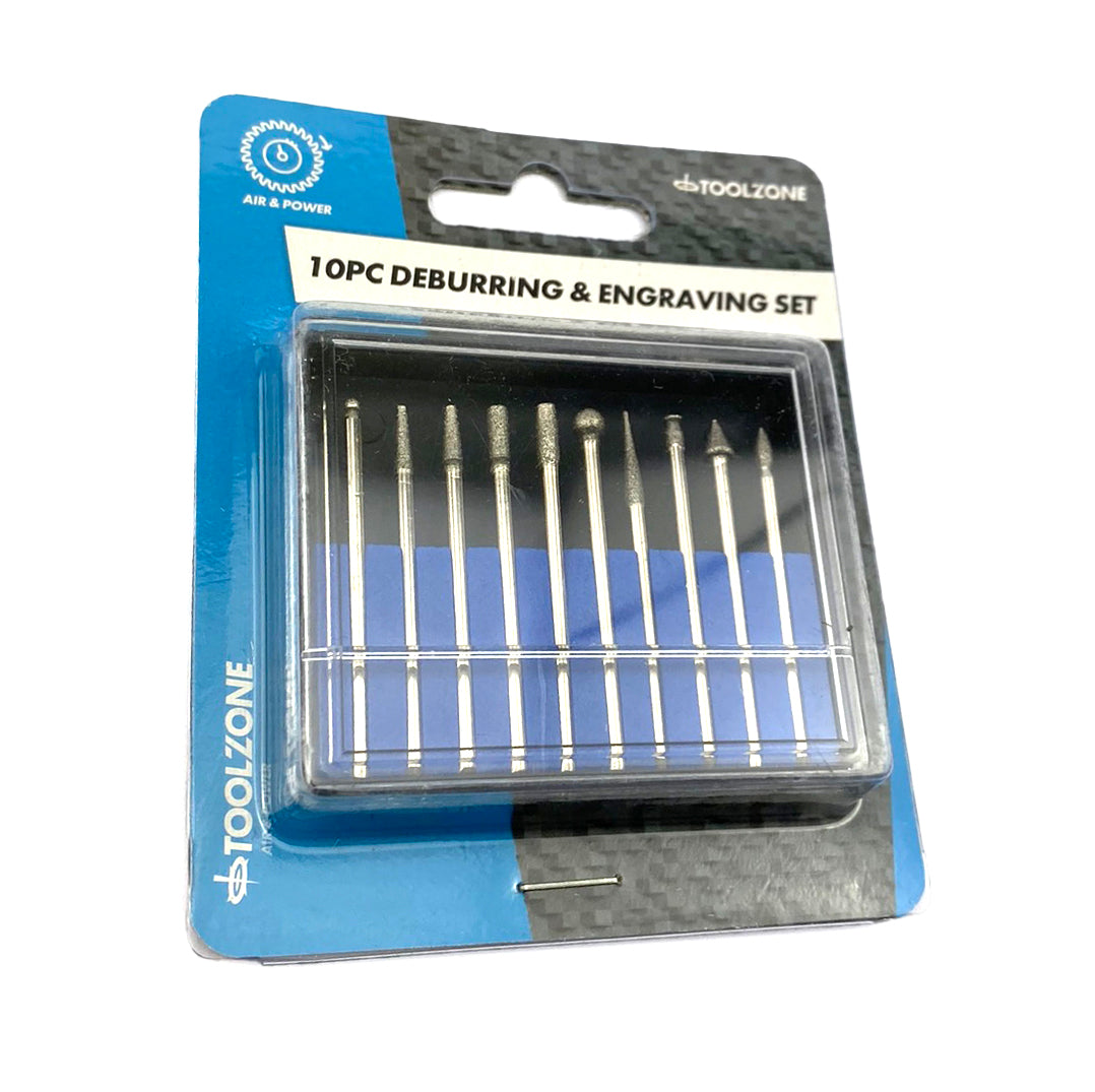 Set of 10 diamond de-burring and engraving tools. With 3/32? shank and 150 grit diamond tips. Assorted points; round, cylindrical and cone shaped. For use on ceramics, tile, brick, glass, plastics, fibreglass, stone and wood.