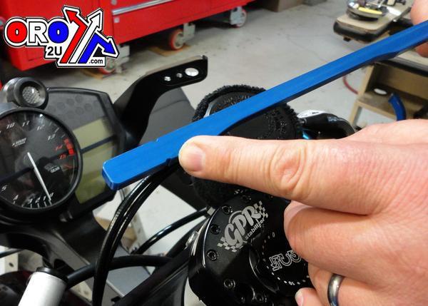 The tool works by measuring the handlebar position on one side and transferring the measurement to the other, allowing for precise adjustments. It can be used on most motorcycles, though some may require the removal of accessories, such as fairing brackets or steering dampers, for proper placement.