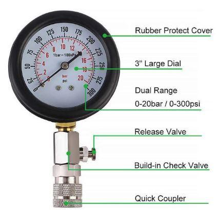 Dual Gauge Readings: 0-300psi, 0-20bar (1bar=100kPa)