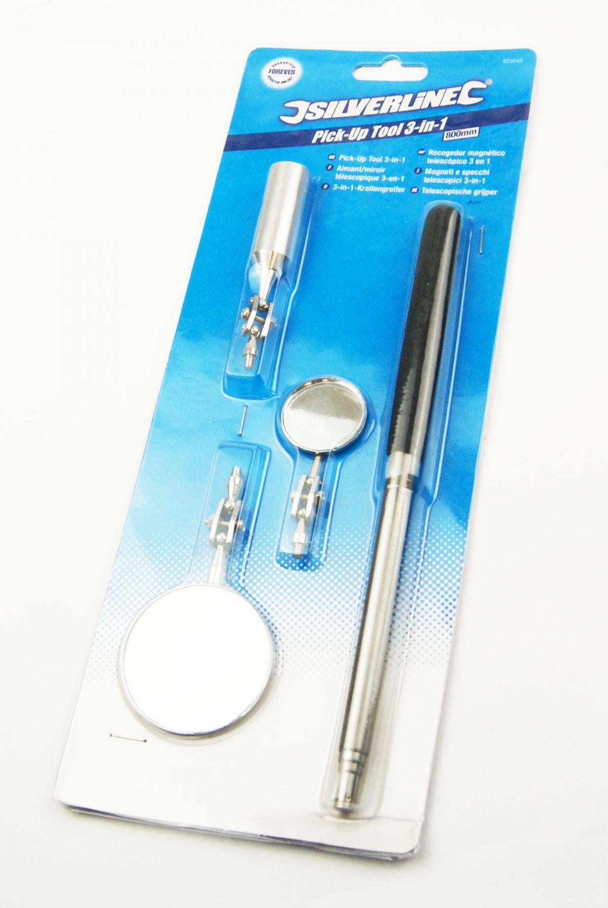 Multi-headed inspection / pick-up tool, with telescopic shaft, magnetic pick-up head, standard and magnifying mirror. Vinyl-dipped handle extends to 800mm.