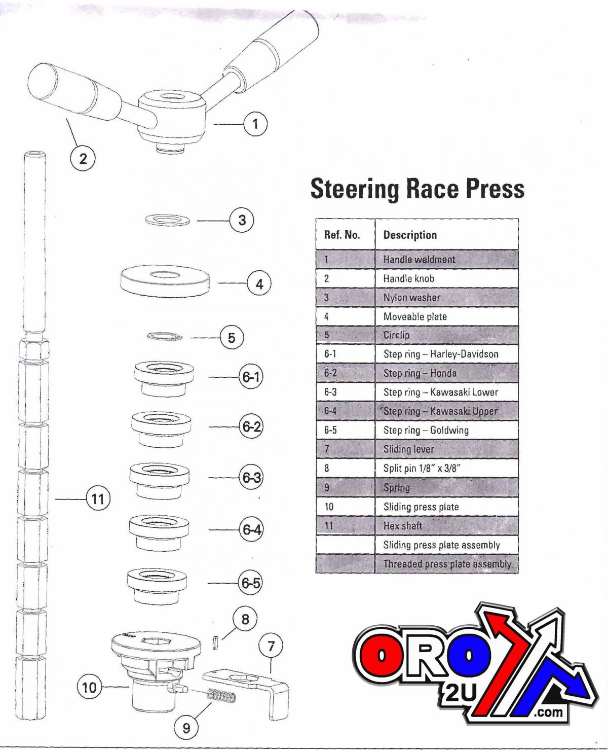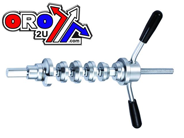 Combination Cup press and bearing driver set. Set includes tool for installing steering bearings, bushings attach to bearing installer and installed using an impact hammer. Set also includes a Steering cup press which easily and accurately installs steering stem races. Eliminates damage and misaligned bearing races. Helps prevent dented and chipped frames. Also comes in a handy injection moulded plastic carry case.