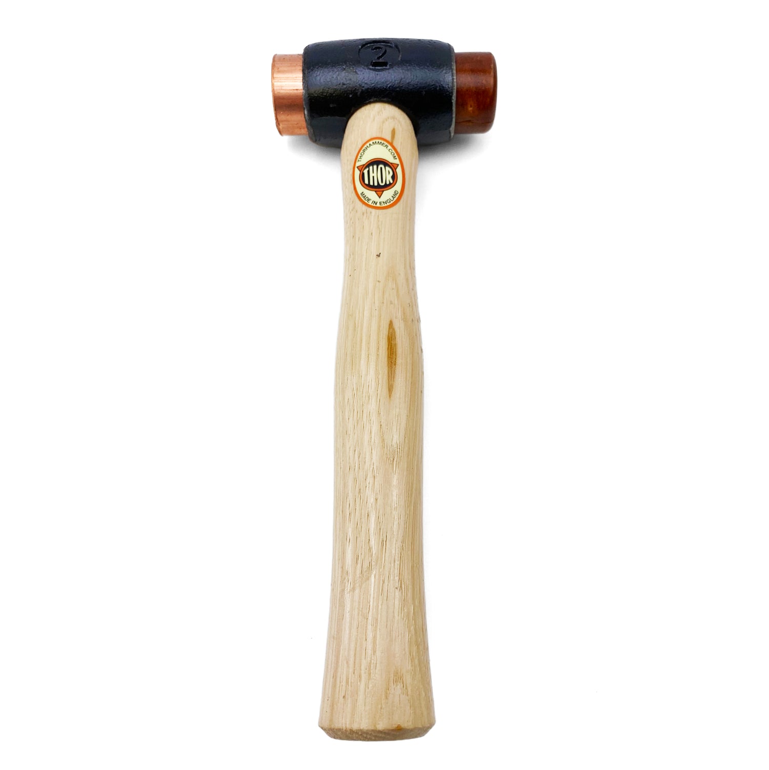 Malleable iron head fitted with one face of pure copper and the other of highly compressed Buffalo rawhide; and an oval ash handle The copper face gives a safe but high-impact blow, the rawhide face a firm yet more resilient blow that will not