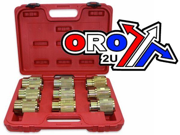00-896This 9-piece Fork Seal Driver Set is designed for easy installation of most fork seals on both conventional and inverted forks, making it suitable for a wide range of workshop applications. Manufactured from carbon steel with a golden plate finish, each driver features a split design and weighted body to ensure proper handling and durability.