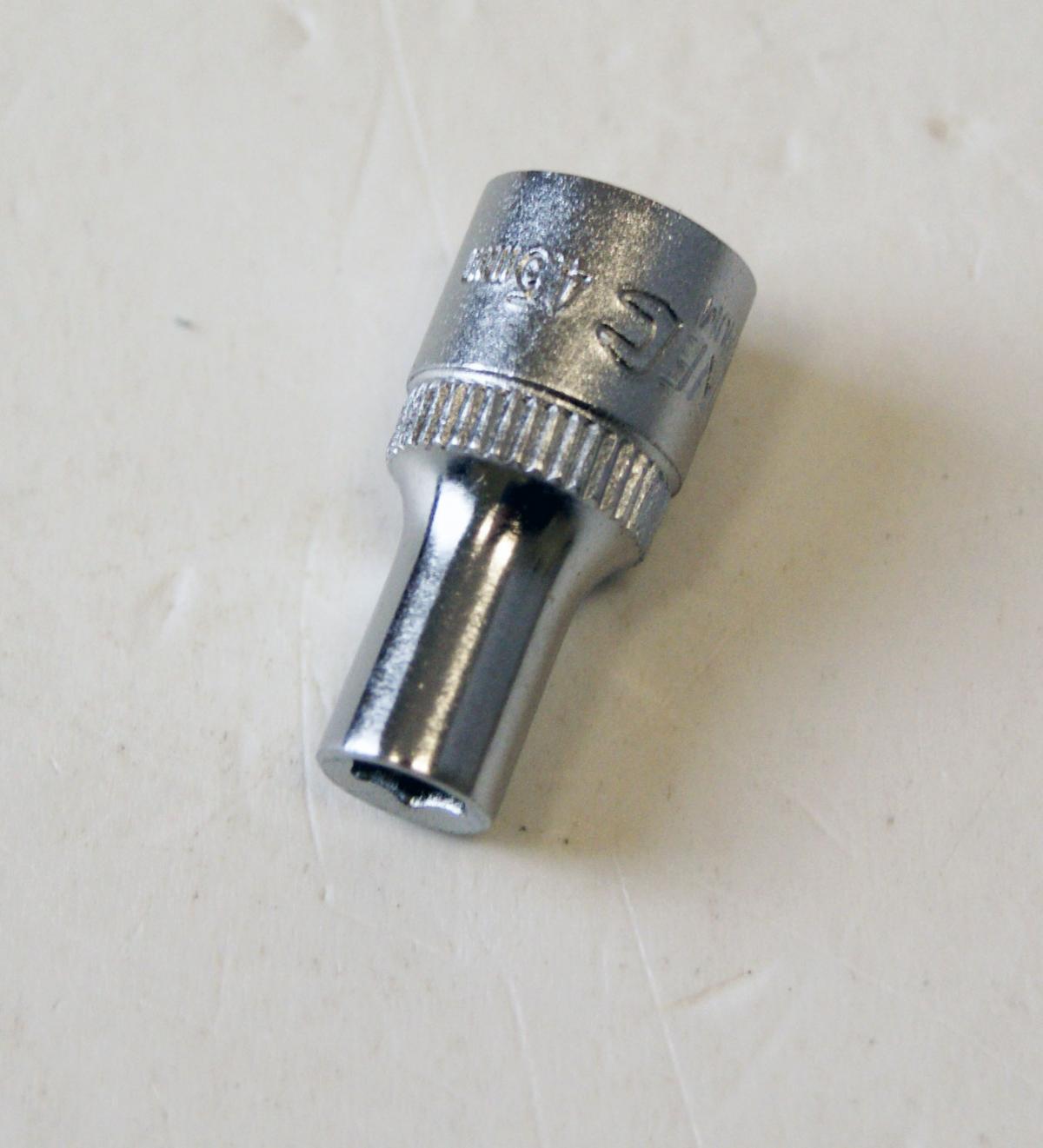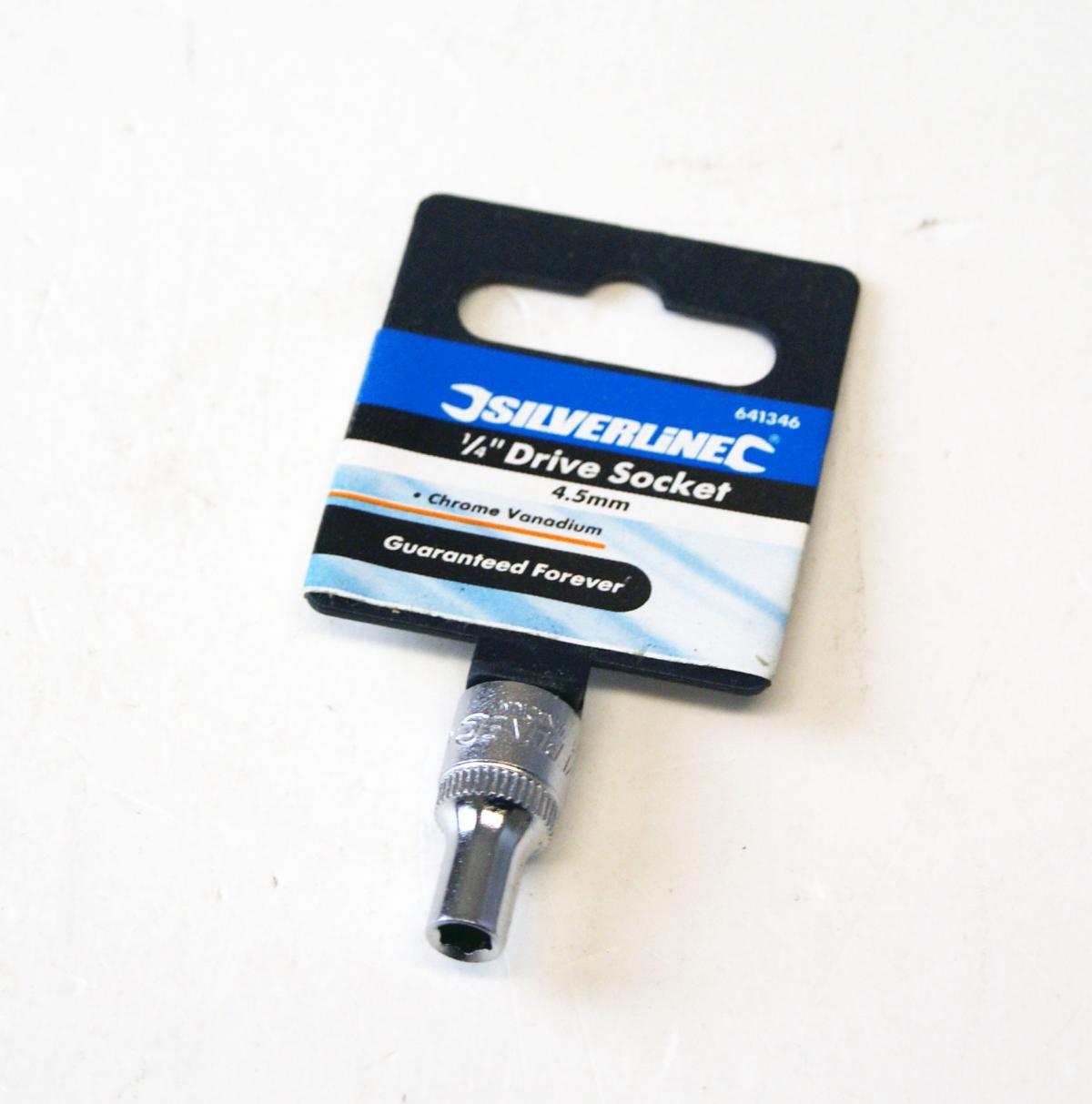 4.5mm Replacement socket Manufactured from chrome vanadium steel, hardened, tempered chrome plated and satin finished, chamfered ends for positive nut location and special radius design to give added torque and life expectancy. Sockets have a knurled band for extra hand grip and a hole for positive ball retention.