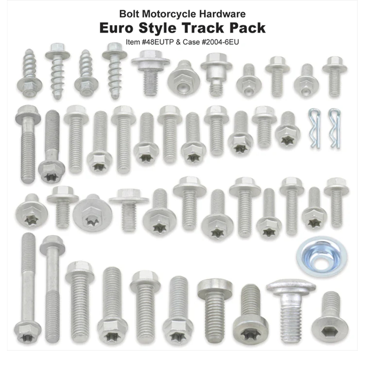 available. The Euro Style Track Pack has factory replica 8mm & 10mm hex flange bolts with Torx sockets in M5, M6 & M8 sizes, M5 shroud screws, M6 shroud screws (ejot), fork guard bolts, a sub-frame bolt, Brembo style brake pin clips and convex washers.