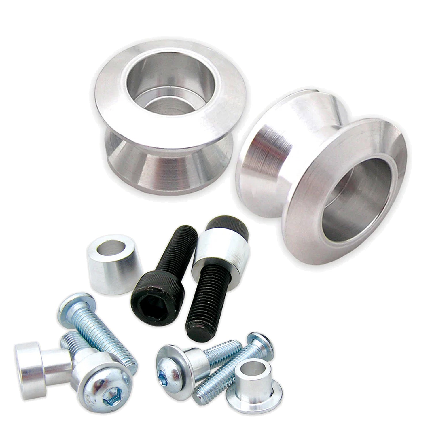 The only truly universal swingarm spool kit, our billet aluminum spools have the right adapter and the right size fastener to fit your bike. Made from 6061 billet aluminum, our low profile design stays clear of the track at all lean angles. The tapered base of the spool guides lifting forks