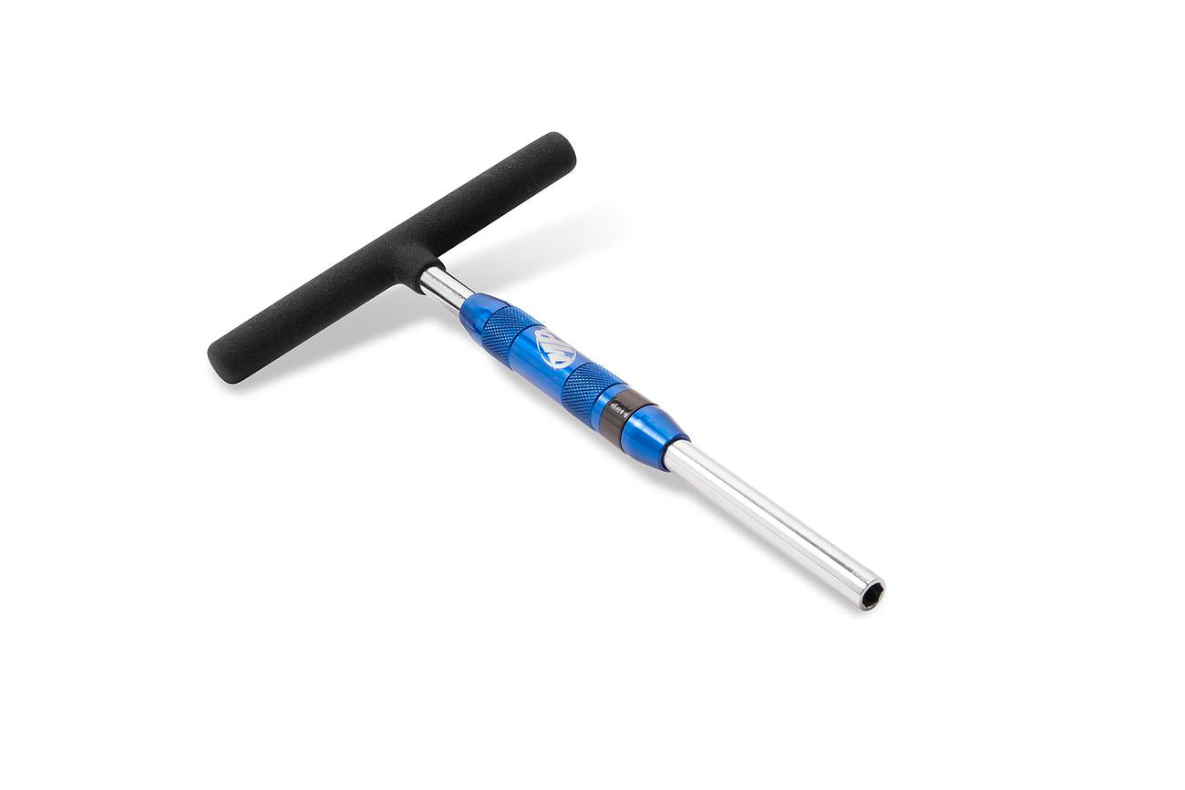 09-1004The T-Handle Bit Driver Spinner is designed to facilitate the quick removal and installation of bolts and nuts. Its bearing-mounted spinner allows for faster operation, while the 1/4-inch hex drive head accepts most common driver bits, secured in place by an internal magnet. The tool features a narrow drive head profile for accessing tight spaces, a padded grip handle for comfort, and an 8-inch chrome vanadium shaft with a durable chrome finish. The blue anodized spinner is laser-engraved with the Motion Pro logo. Please note that bits are not included.
