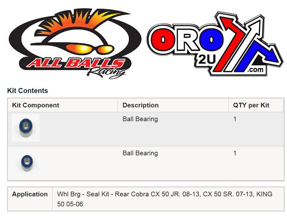All Balls Racing Wheel Bearing Kit Rear 05-13 Cobra Cx/king 50, Allballs 25-1681 Dirt