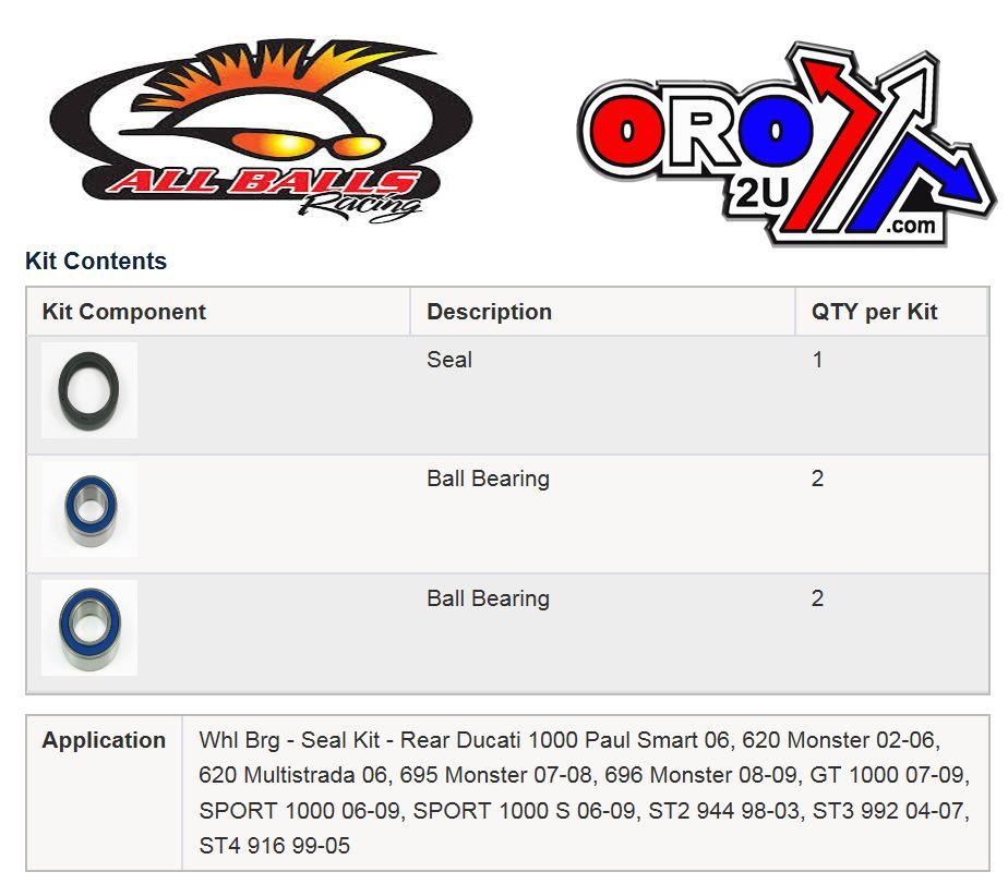 All Balls Racing Wheel Bearing Kit Rear 98-14 Ducati Gt/st/sport/mons/multi, Allballs 25-1668 Road