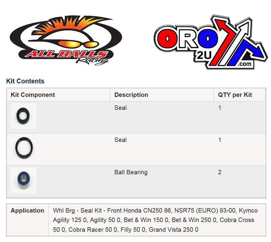 All Balls Racing Wheel Bearing Kit Front 86-21 Hon Cn/nsr/kymco/suz DR-z50, Allballs 25-1644 Road/dirt