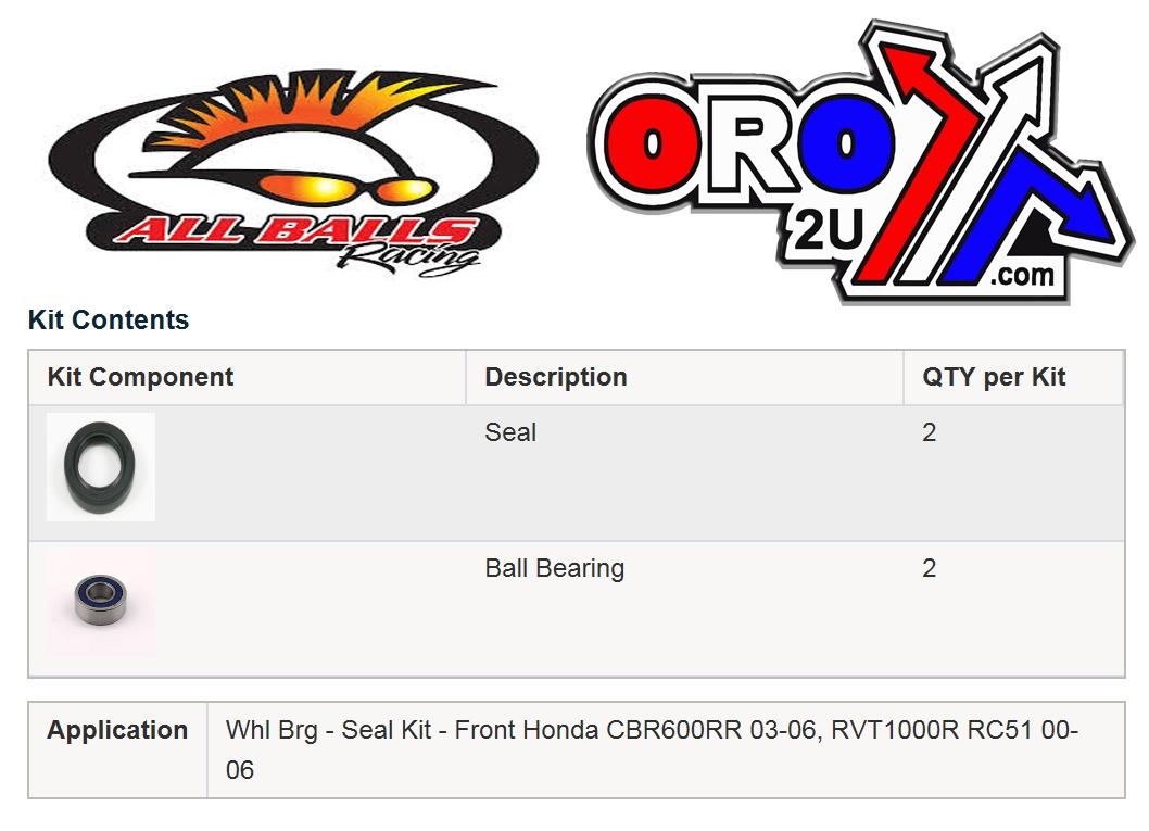 All Balls Racing Wheel Bearing Kit Front 00-06 Hon CBR600/rvt1000 RC51, Allballs 25-1654 Road
