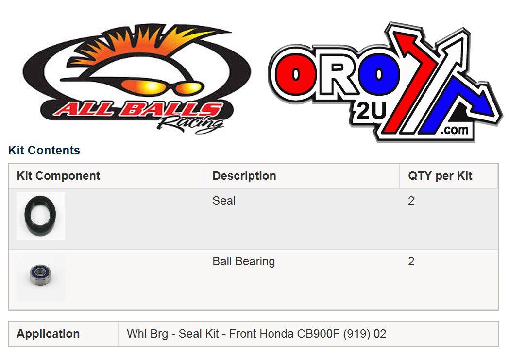 All Balls Racing Wheel Bearing Kit Front 2002 Hon CB900F, Allballs 25-1655 Road