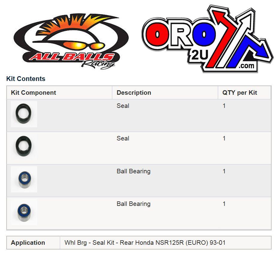 All Balls Racing Wheel Bearing Kit Rear 93-01 Hon NSR125R, Allballs 25-1652 Road