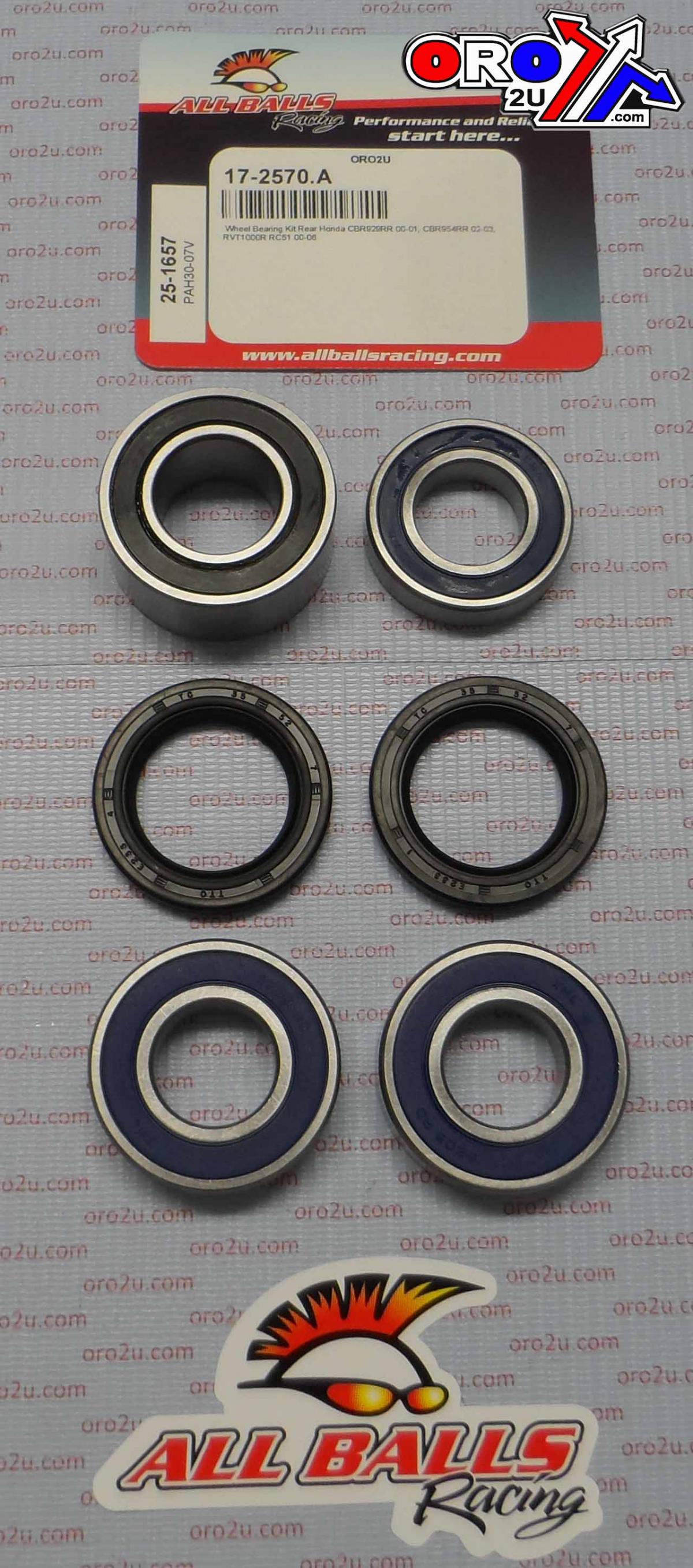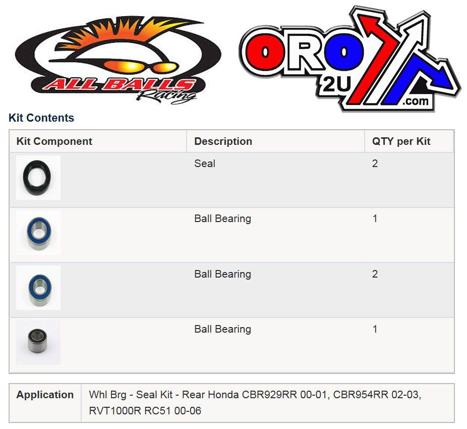 All Balls Racing Wheel Bearing Kit Rear 00-06 Hon CBR929/954/rvt1000 RC51, Allballs 25-1657 Road