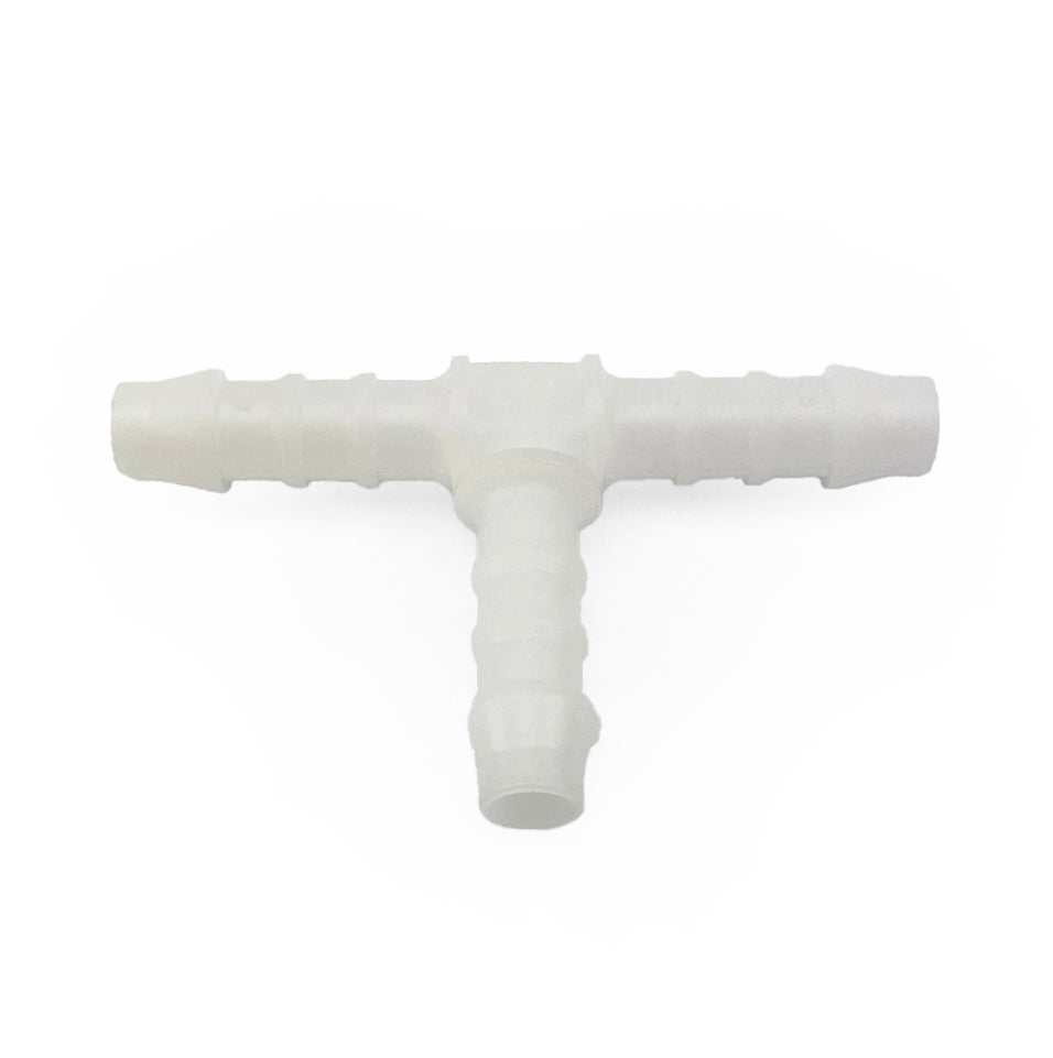 White fuel-resistant plastic (Acetal) Fitting used to run two hoses into one May be used with O-Clips or hose clamps