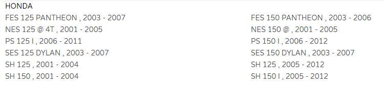 FES 125 PANTHEON JF12 , 2003 - 2004, FES 125 PANTHEON JF12 , 2005 - 2007, FES 150 PANTHEON KF06 , 2003 - 2006, NES 125 @ JF07 , 2001 - 2004, NES 125 @ JF07 , 2005 - 2005, NES 150 @ KF03 , 2001 - 2004, NES 150 @ KF03 , 2005 - 2005, PS 125 I JF17 , 2006 - 2011, PS 150 I KF09 , 2006 - 2012, SES 125 DYLAN JF10 , 2003 - 2004, SES 125 DYLAN JF10 , 2005 - 2007, SES 150 DYLAN KF05 , 2003 - 2004, SES 150 DYLAN KF05 , 2005 - 2007, SH 125 JF09 , 2001 - 2004, SH 125 I JF09 , 2005 - 2006, SH 125 I JF09 , 2007 - 2008, SH 125 I JF23 , 2009 - 2011, SH 125 I , 2012 - 2012, SH 150 KF04/08 , 2001 - 2004, SH 150 I KF04/08 , 2005 - 2006, SH 150 I KF04/08 , 2007 - 2008,