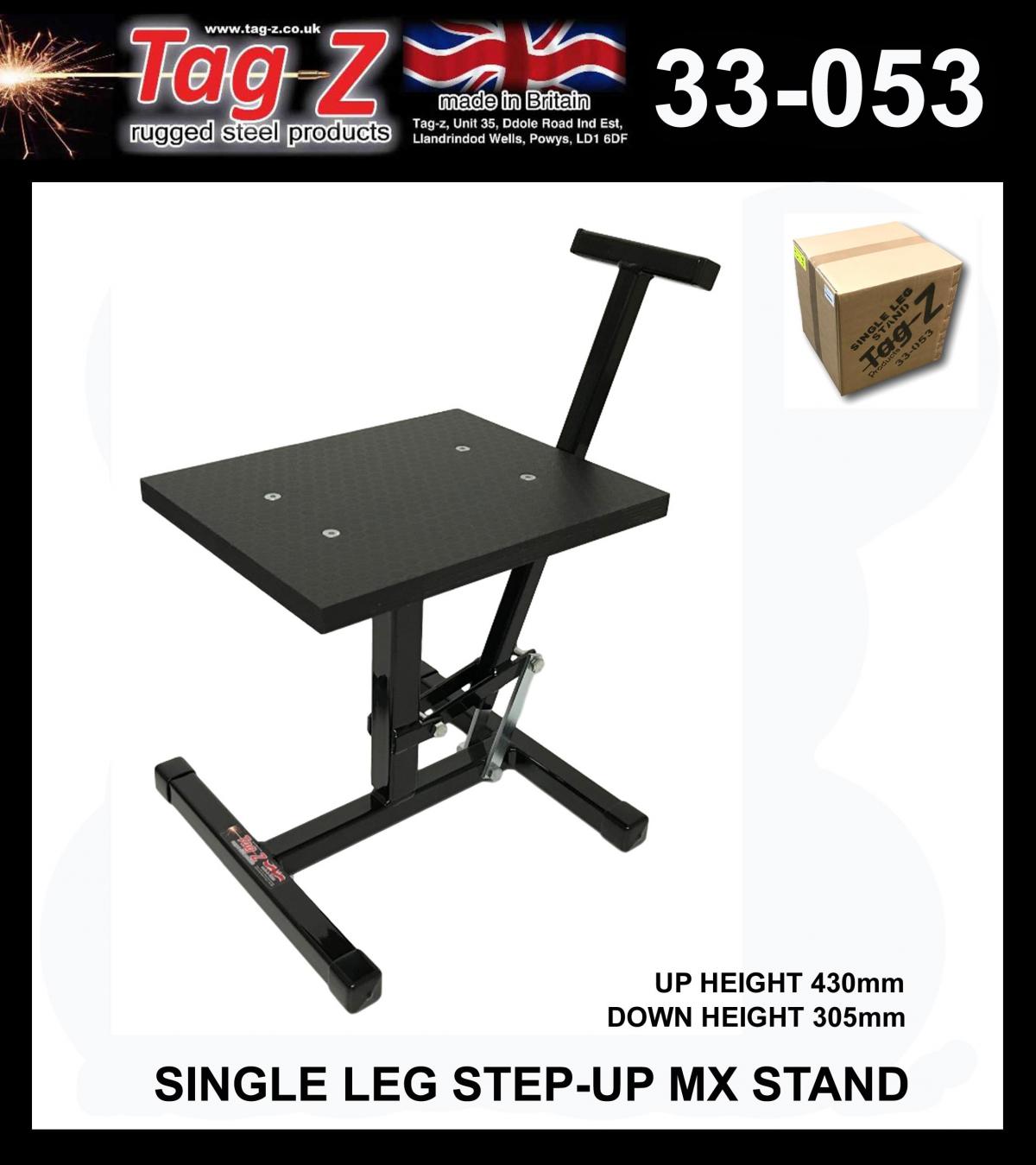 (Off Road Only)TAG-Z Foot lever operated dirt bike stand for both workshop and paddock use. Constructed from high quality steel with a powder coated finish. Foot operated, leaving both hands free to support bike when raising and lowering the stand. Max weight 250kg.