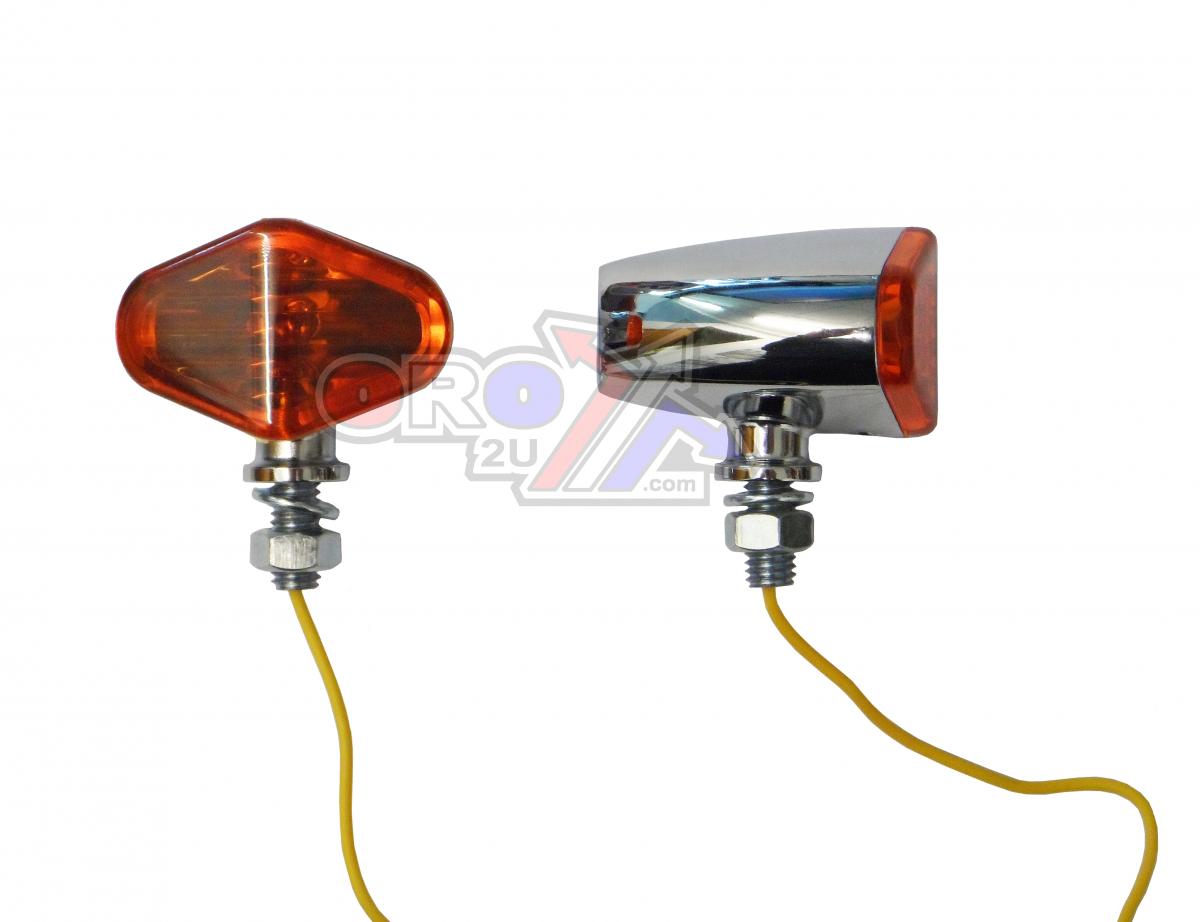 Diamond Indicators with Chrome effect case. Bulbs 12v,23w. Size: 38mm H x 48mm W x 50mm D. M8 x 15mm stem. Come as a Set of 2