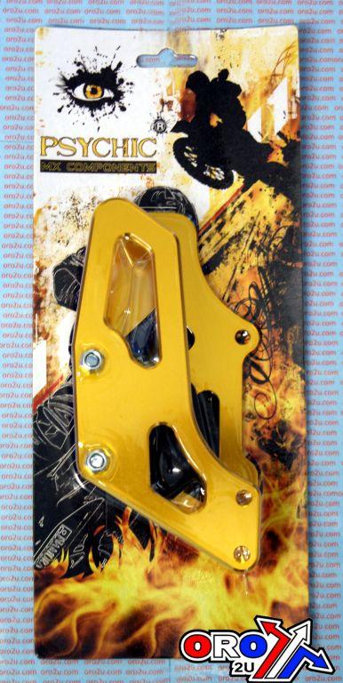 Psychic Chain Guides. Constructed from CNC machined high quality aluminium. Comes complete with a long wear chain guide and hadware. Available in anodized gold colour.