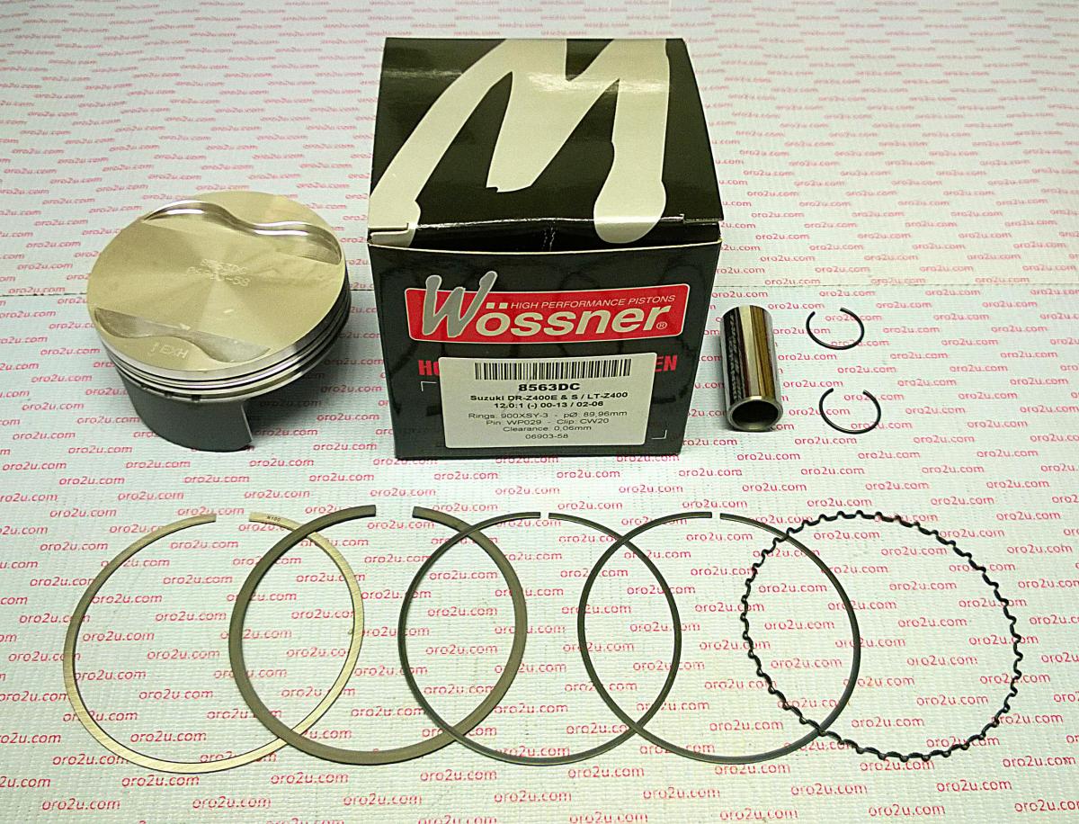 56-W4713.A.WOWossner forged piston kit with a 90mm bore (89.94mm actual) is designed for Suzuki LT-Z400, DRZ400E, and DRZ400S models. Engineered for strength and optimal heat transfer, the piston features an elliptical design that ensures even load distribution, reducing localized pressure and preventing piston collapse. Manufactured in Germany, it maintains OEM compression specifications.
