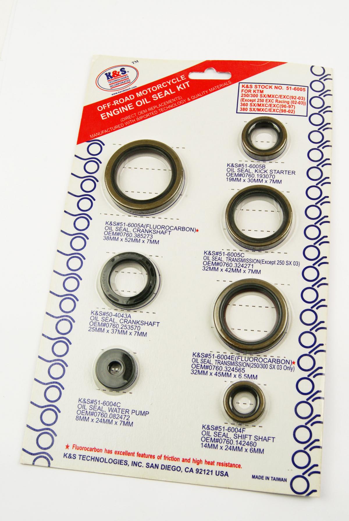 51-6005. COMPLETE ENGINE SEAL KIT. KTM 250 SX/MXC/EXC (92-99). KTM 250 SX (00-02). KTM 250 MXC/EXC (00-03) (Except EXC Racing 02-03). KTM 250 SX/MXC/EXC (04) (Except EXC Racing 04). KTM 300 SX/MXC/EXC (92-04). KTM 360 SX/MXC.