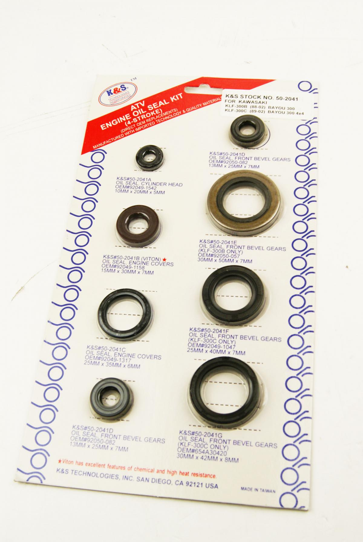 KAWASAKI KLF-300 B (88-04) Bayou 300 KAWASAKI KLF-300 C (89-06) Bayou 300 4x4 This is a complete direct OEM replacement kit from K&S Technologies, Inc. Includes all engine oil seals for a complete rebuild.
