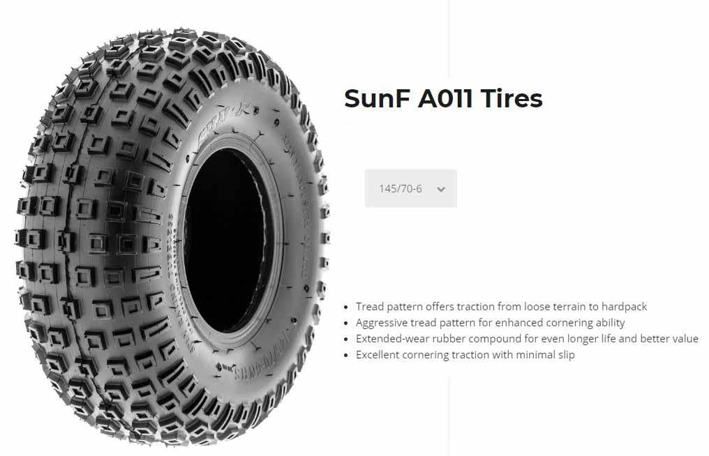 The SunF A-011 tire features a mildly aggressive offroad footprint that is optimized for performance in karting or youth ATV. The tire is made of a durable rubber compound that maintains its light weight to ensure you are not weighed down as you race.