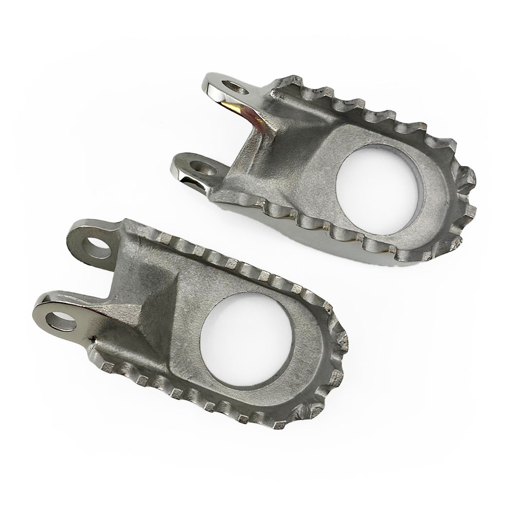 Feature extra wide foot area with deep cleets to keep you in control while putting less stress on a small portion of your foot. Large hole in the centre of the foot peg to eliminate mud / dirt build up. The design of the pegs give maximum strength for the lightest weight. Made from stainless steel so no more rusty pegs and fast spray jobs before the next event. 44mm Wide.