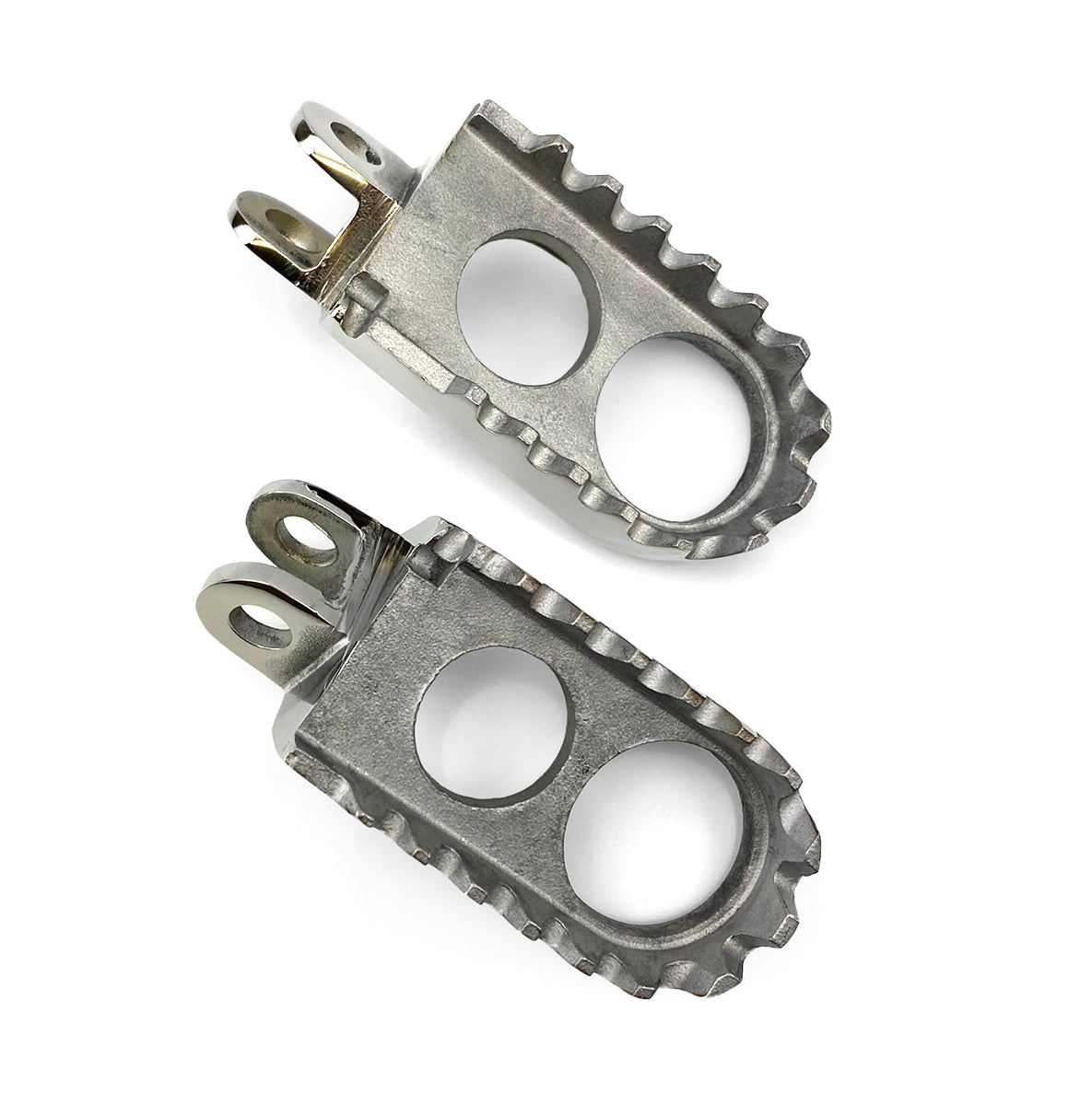 Feature extra wide foot area with deep cleets to keep you in control while putting less stress on a small portion of your foot. Large hole in the centre of the foot peg to eliminate mud / dirt build up. The design of the pegs give maximum strength for the lightest weight. Made from stainless steel so no more rusty pegs and fast spray jobs before the next event. 44mm Wide.