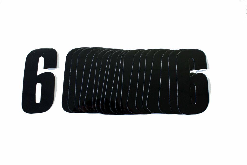 4.5"Race Numbers. Available in black or white. Numbers are available in a pack of 20 per number or as a Pack of 108 mixed 0 to 9.
