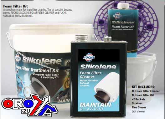 -1 x 4 Litre Fuchs Silkolene Foam Filter Cleaner -1 x 1 Litre Fuchs Silkolene Foam Filter Oil -1 x 15 Litre Filter Cleaning Bucket -1 x 5 Litre Filter Oiling Bucket -6 x Pairs of Protective Gloves
