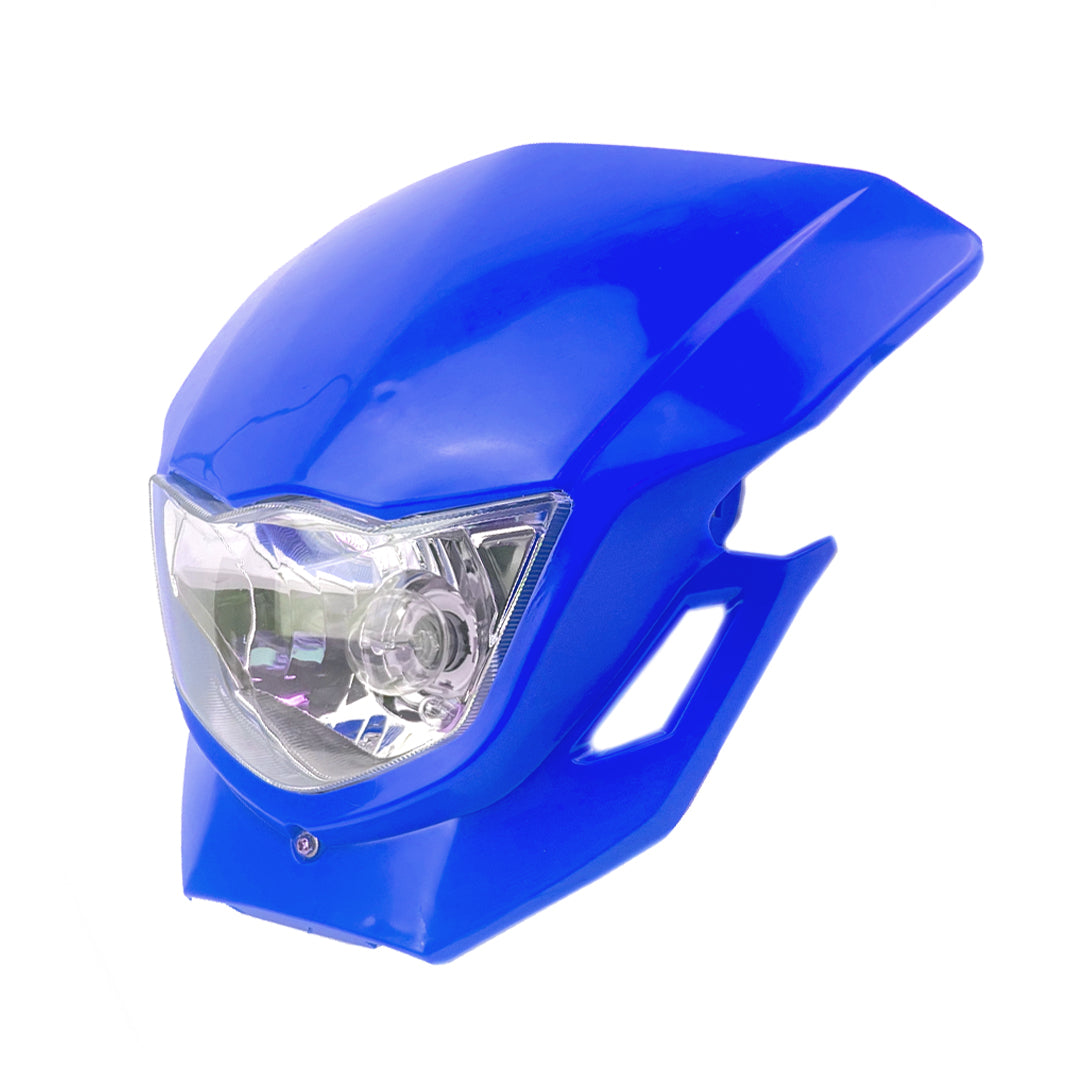 75-127.BEThis blue universal dirt bike headlight is designed for off-road use and includes a Bosh BA20D 12V 35/35W main bulb along with an additional side light bulb. The headlamp features an adjustable beam height from the front. It is equipped with a 4-pin female square socket and standard wire colour coding for simple installation.
