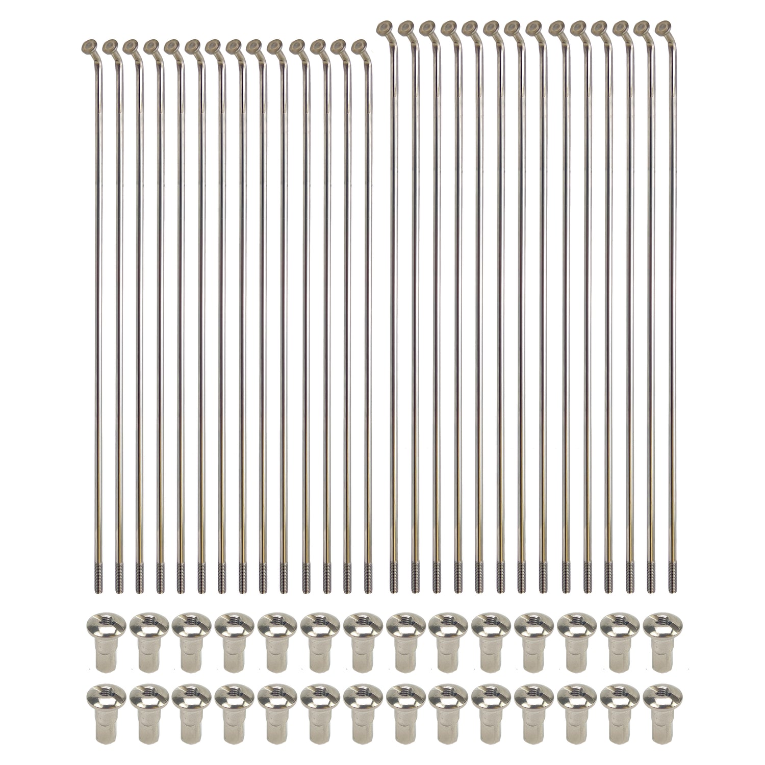 This spoke set has 28 spokes with nickel plated steel nipples. For: 10 inch. rear wheel. Spoke size: 14 spokes of 3,2x73 mm, outer spoke on both
