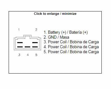 - 5-Pin Plug Configuration: Top (B+, Open, Ground), Bottom (3) Charging Coil