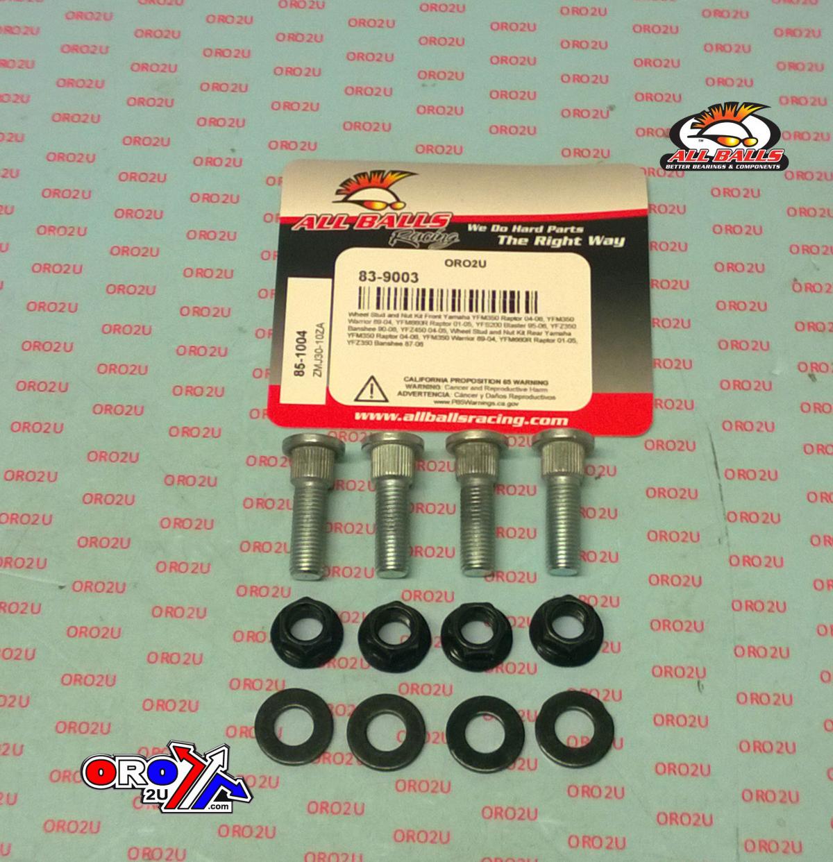 83-9003This wheel stud and nut kit (ALLBALLS 85-1004) is designed for both front and rear wheel applications on various Yamaha sport ATV models. It includes four wheel studs, four nuts, and four washers, providing a complete solution for reliable wheel attachment on Raptor, Warrior, Blaster, Banshee, and YFZ models.