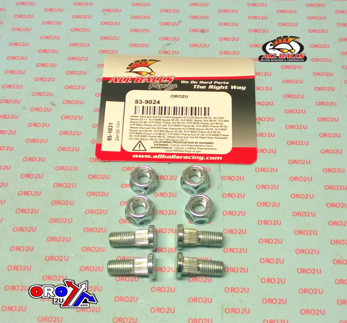 83-9024This wheel stud and nut kit (ALLBALLS 85-1031) is designed for front, rear, and right rear wheel applications on a variety of Kawasaki Bayou and Prairie ATV models. The kit includes four wheel studs and four nuts, providing a durable and secure replacement for wheel fastening.