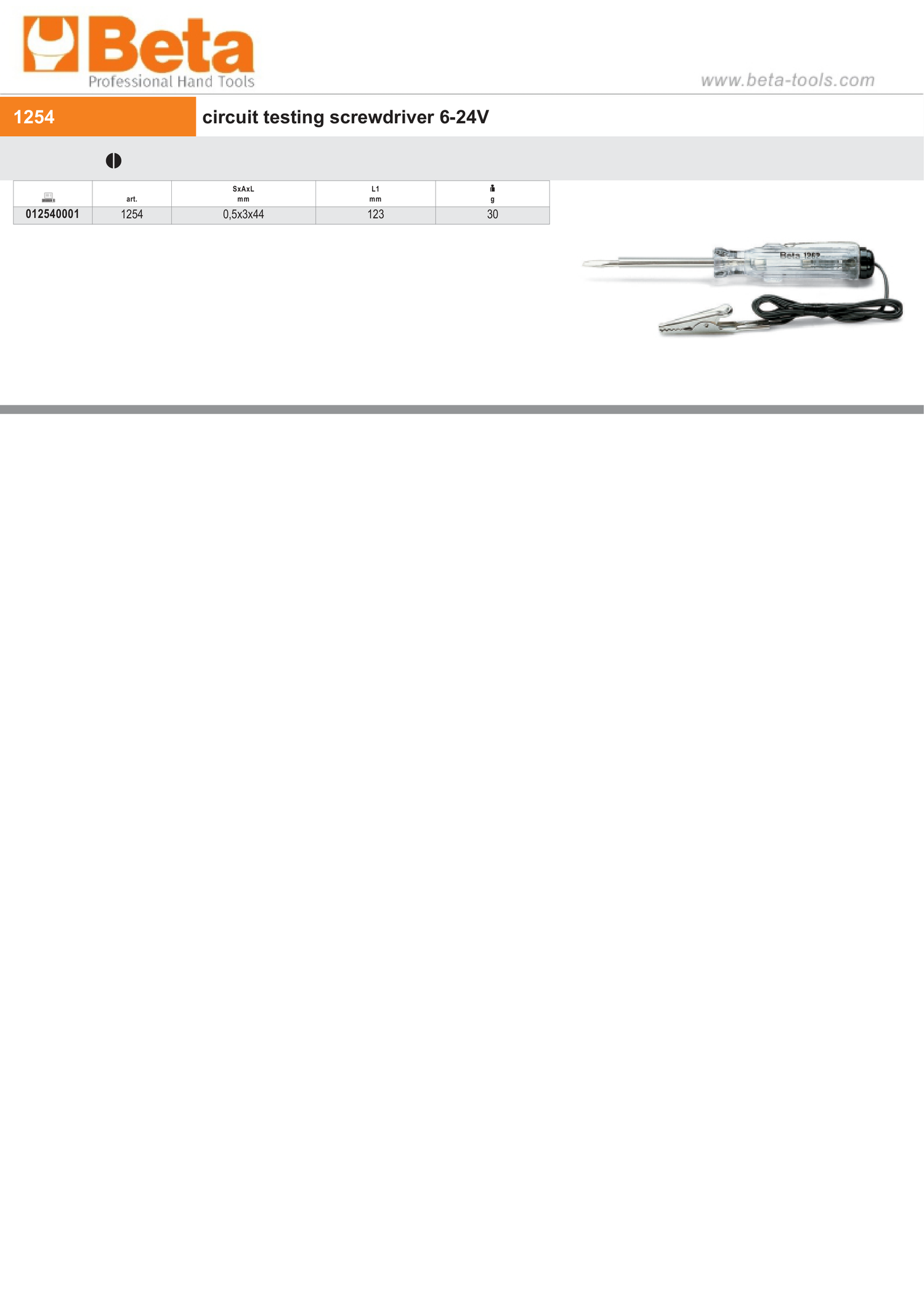 012540001The Beta Tools Circuit Testing Screwdriver 6-24V 0.5mm x 3mm x 44mm - Beta Tools 1254, is an essential tool for professionals who need to test low-voltage circuits safely and accurately. This circuit testing screwdriver is designed to provide reliable performance in automotive and electronic applications.