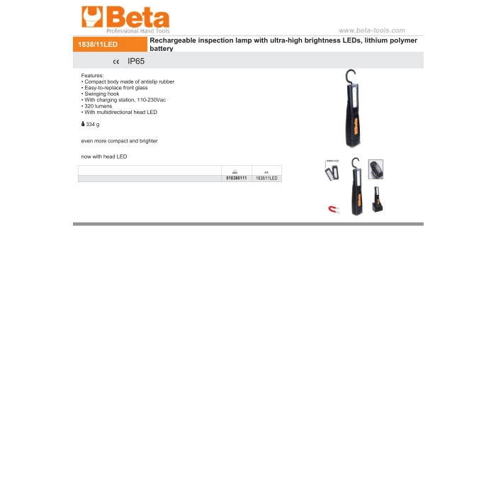 018380111The Beta Tools Rechargeable Inspection Lamp Ultra-High Brightness LEDs 320 Lumens - Beta Tools 1838/11LED is a compact and powerful lighting solution designed for professionals who need enhanced visibility in tight spaces. This lamp is perfect for detailed inspections and maintenance tasks, offering superior brightness and versatility.