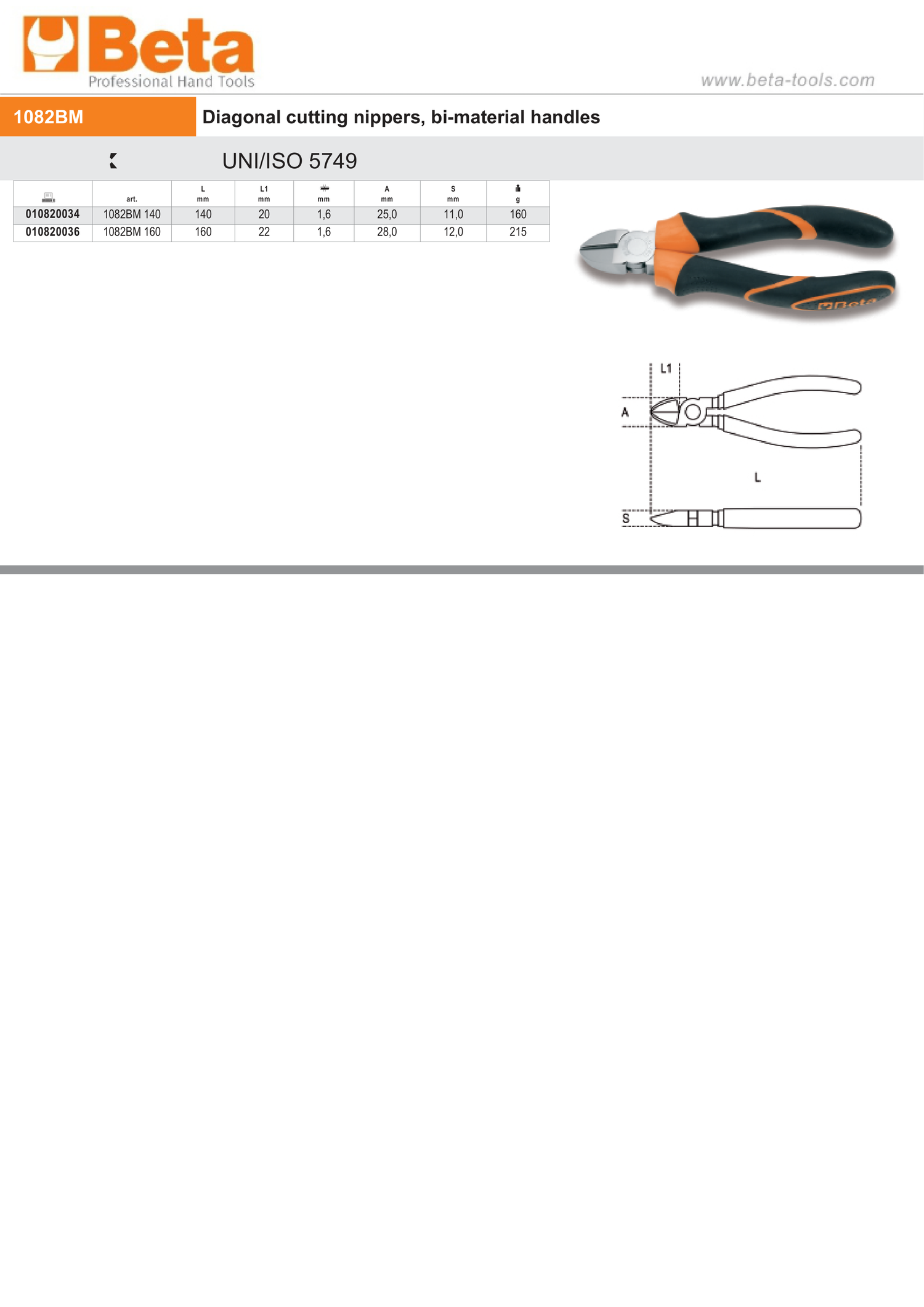 010820036The Beta Tools Diagonal Cutting Nippers with Bi-Material Handles 160mm - Beta Tools 1082BM 160, are designed for precision and comfort in a variety of cutting applications. These nippers feature a diagonal cutting design, providing clean and accurate cuts, making them an essential tool for professionals in electronics, mechanics, and general maintenance.
