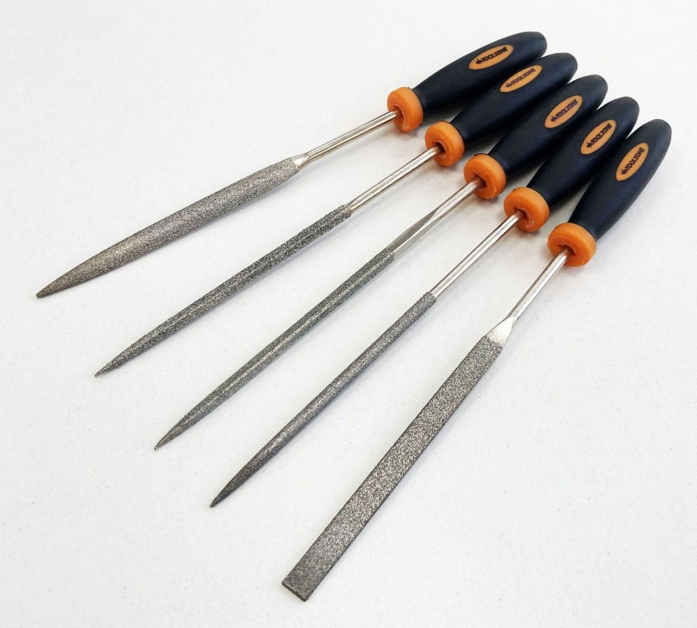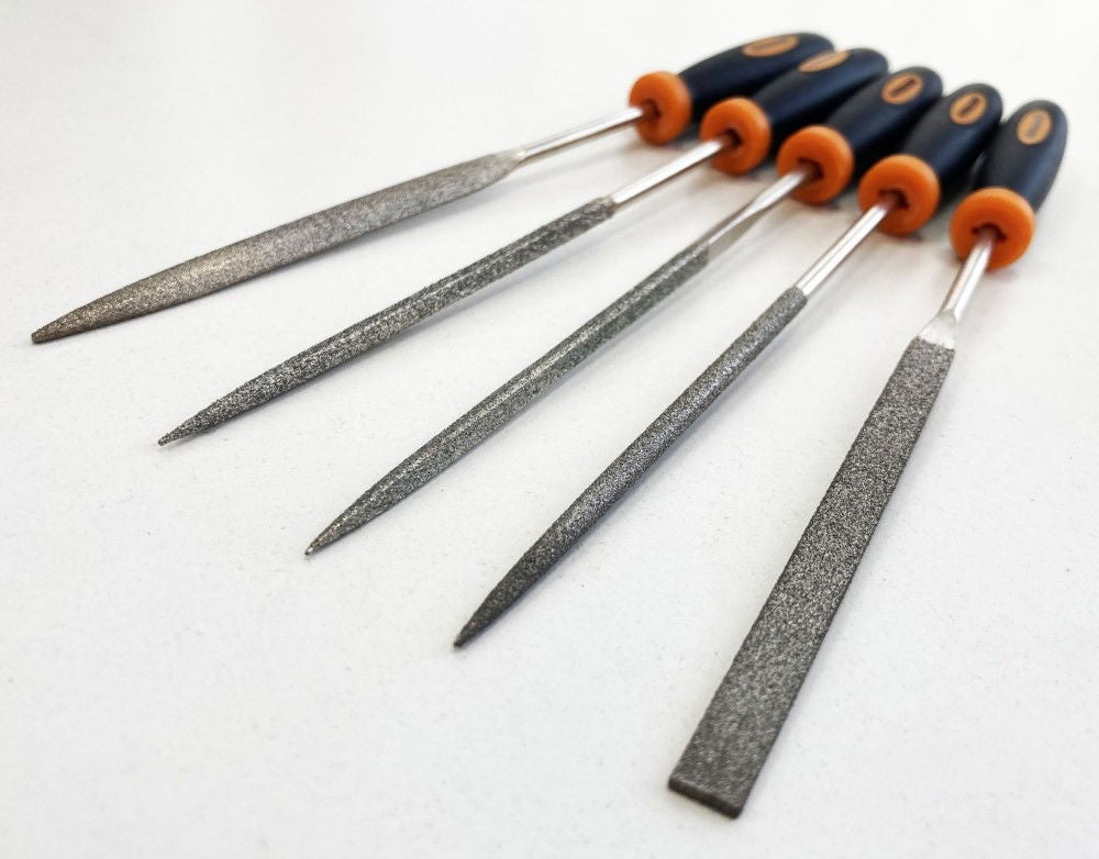 KDP-WW096This 5-piece diamond file set features a 70 mm working surface and 85 mm blade length. The set includes flat, half round, square, triangular, and round taper files, each fitted with blue and yellow soft grip handles.