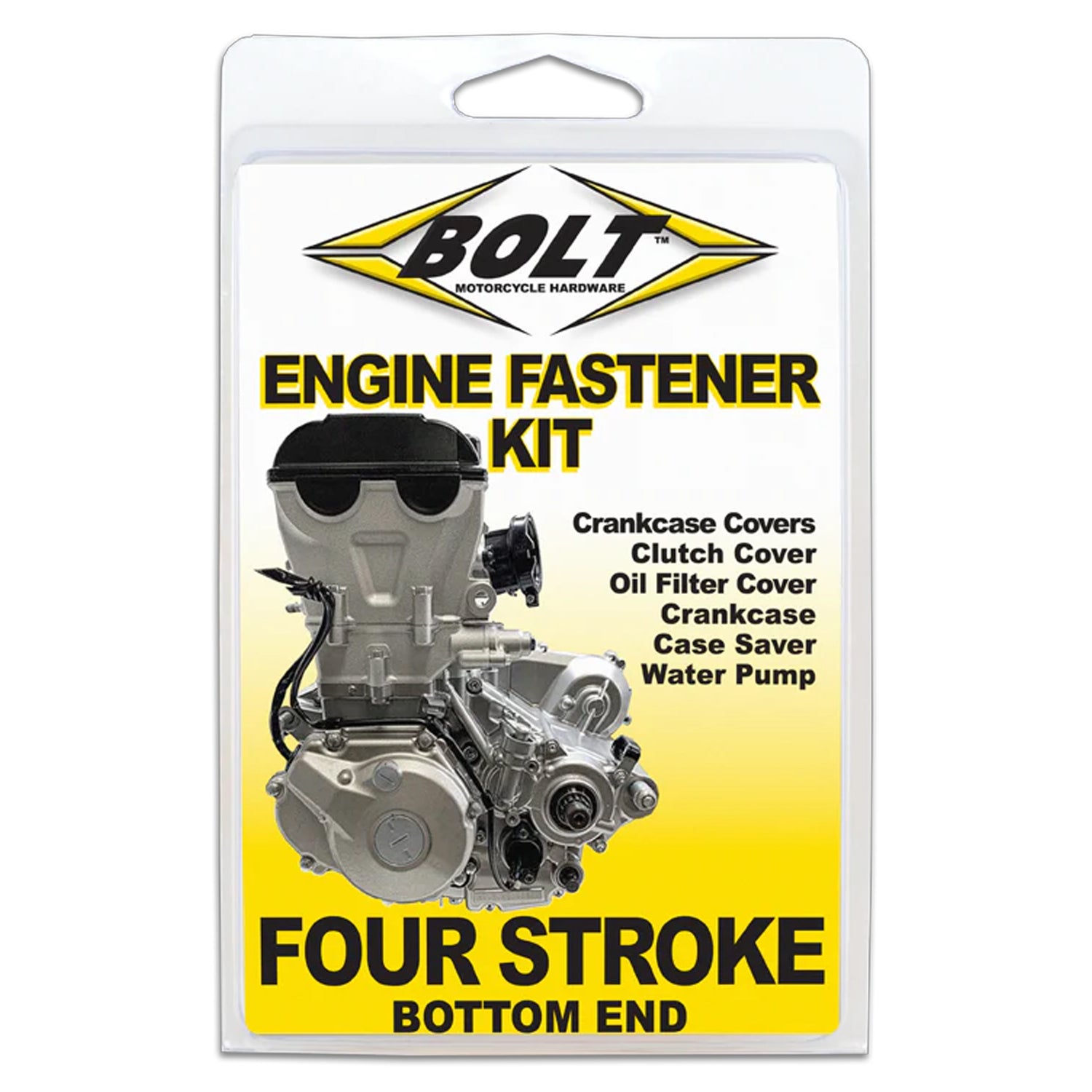 Four-Stroke Engine Fastener kits include bottom-end hardware for the following: Crankcase Covers, Clutch Cover, Oil Filter Cover, Crankcase, Case Saver, Water Pump and various top-end bolts depending on model.