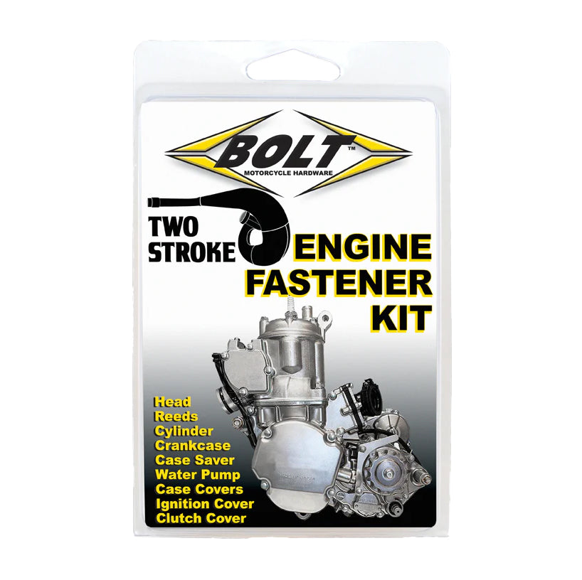 Two-Stroke Engine Fastener kits have all the external fasteners from top to bottom-end including hardware for: Heads, Reeds, Cylinder, Crankcase, Case Saver, Water Pump, Left Case Cover, Ignition Cover, Inner & Outer Clutch Covers, Power Valve Covers.