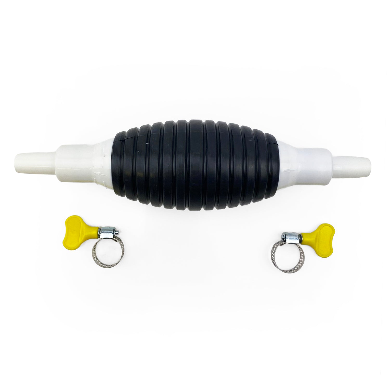 08-8799.FIRThis manual siphon pump features a durable rubber hand pump designed to transfer liquids quickly and efficiently. It includes two yellow fittings that enhance the hose-to-pump seal to prevent leakage. The unit is suitable for various non-corrosive fluids and is ideal for both automotive and household use.