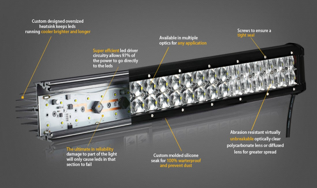 This work light bar features 24 powerful Philips LED diodes with a 10800 Lumen output and crisp 6000K colour temperature, meaning a much purer, more modern and precise light than the yellowish output of traditional halogen bulbs.