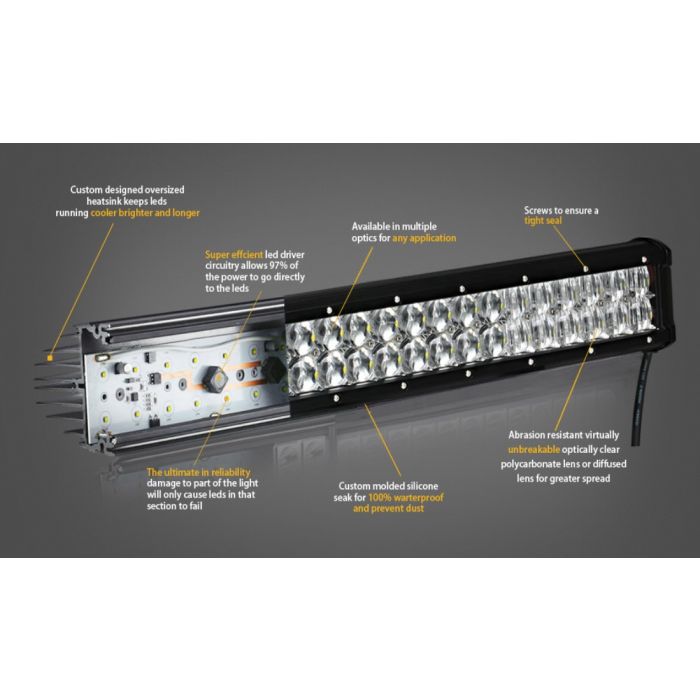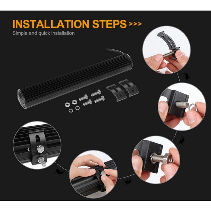 This work light bar features 24 powerful Philips LED diodes with a 10800 Lumen output and crisp 6000K colour temperature, meaning a much purer, more modern and precise light than the yellowish output of traditional halogen bulbs.
