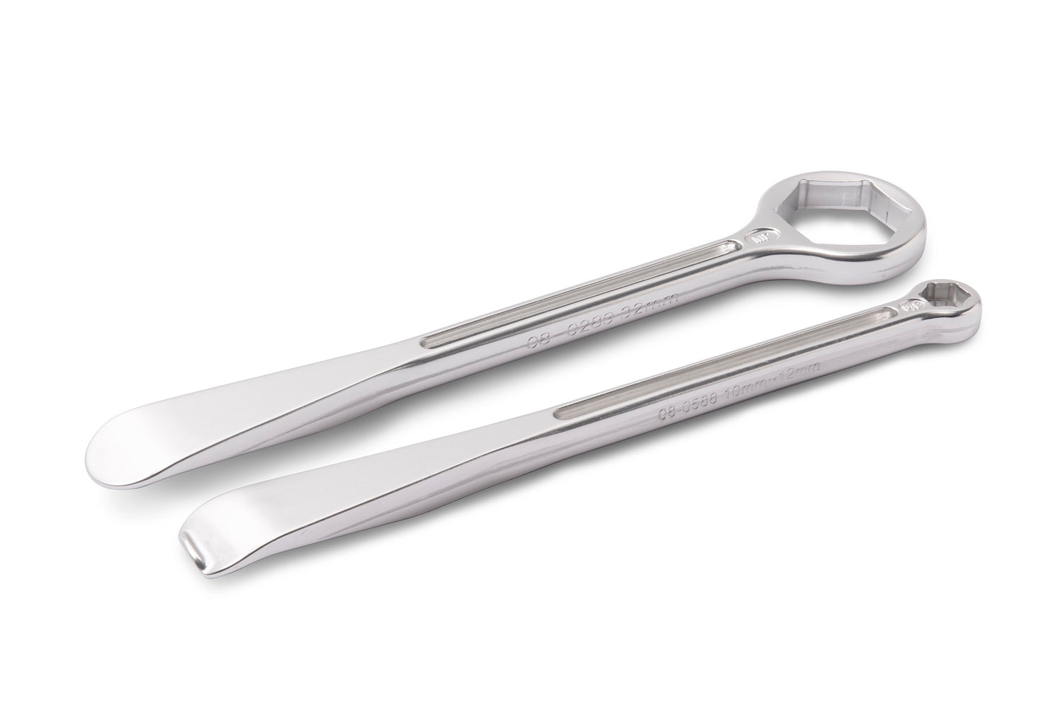 00-0775.MPThe T-6 Combo Lever Set is a versatile tool designed for efficient tyre changes and axle maintenance. Each lever features a contoured tyre spoon on one end, facilitating easy tyre removal and installation. One lever includes a stepped 10/12 mm box-end wrench for rim lock nuts, while the other has a 32 mm hex box wrench suitable for axle nuts. The unique no-pinch tip design helps protect the inner tube during tyre installation.