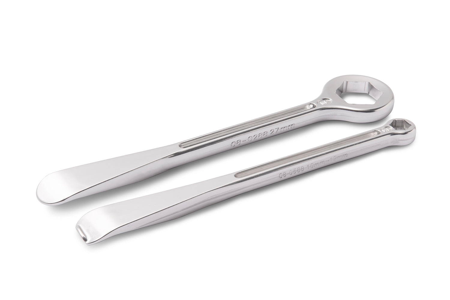 00-0774.MPThe T-6 Combo Lever Set is a versatile tool designed for efficient tyre changes and axle maintenance. Each lever features a contoured tyre spoon on one end, facilitating easy tyre removal and installation. One lever includes a stepped 10/12 mm box-end wrench for rim lock nuts, while the other has a 27 mm hex box wrench suitable for axle nuts. The unique no-pinch tip design helps protect the inner tube during tyre installation.