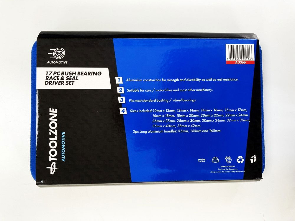 KDP-AU366This 17-piece bush, bearing race, and seal driver set is constructed from aluminium and designed for use with vehicles and most other machinery. The set accommodates standard bushings and wheel bearings and includes a variety of sizes as well as three long handles. Components are supplied in a blow-molded case.