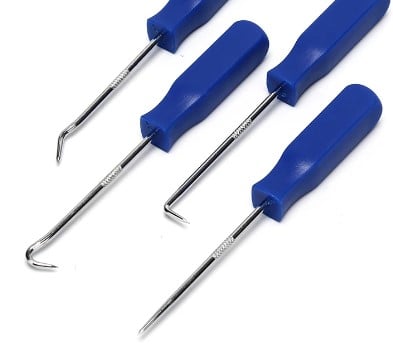 - Tools included: straight pick, 90° pick, full hook, and angled hook